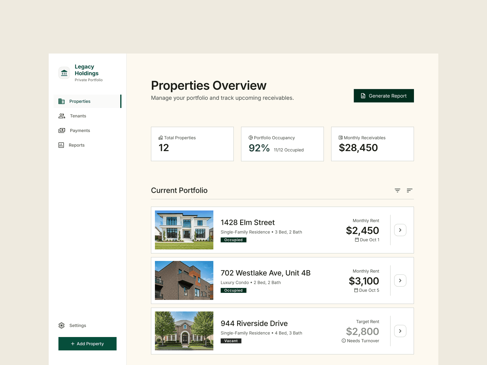 Landlord reports as a first class feature. Not an afterthought. We designed the monthly PDF report first and built the rest of the tool to feed it.