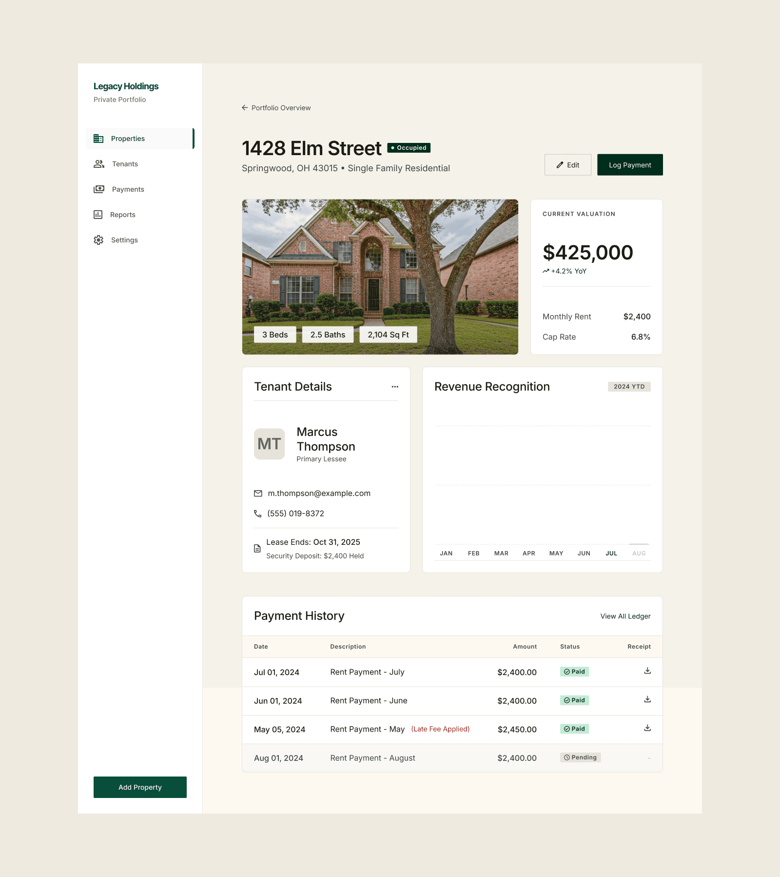 Landlords asked questions nobody could answer fast. "What did my building earn last quarter?" required 3 hours of spreadsheet work every time.